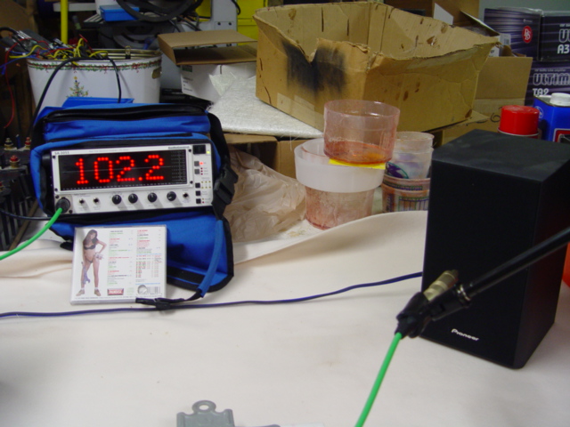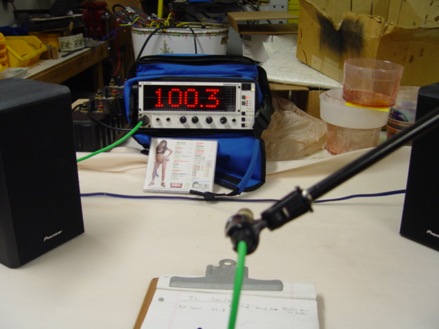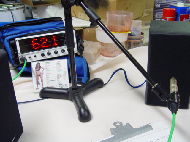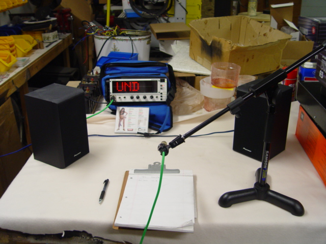 To remove the possibility of extraneous sources of "interference" with these measurements in a vehilce (processors, EQs, wiring, passive or active crossovers, phase shifts, etc etc etc), i used a very simplistic setup as the testing "system"--a single stereo head unit on my work bench to drive the amplifiers directly via standard RCA cables, and the amps then sending output to a stereo pair of full-range home speakers. I then used a test tone , in this case 800Hz, which is planted firmly within the freq range of the 4" midrange driver of the bookshelf monitors. An Audio Control RTA meter was used with a stationary mic stand to record the measurements. Let's look at the setup...