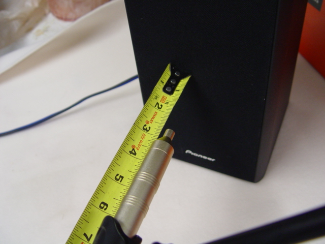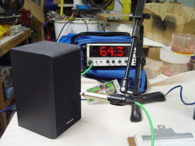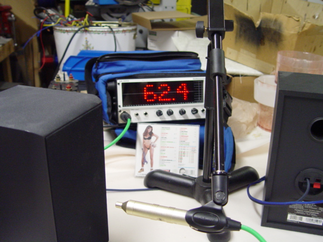 First, I want to test the left channel of the JL amp. I position the mic to be 2.5" from the left speaker. I measure the ambient room volume with the system OFF, in dB.